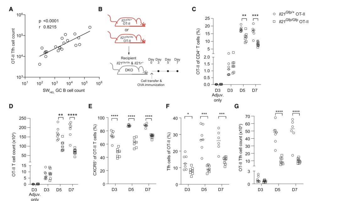 在免疫学飞速发展的背景下,科学家发现IL-21与T细胞以及B细胞的分泌关系密切,探索这其中的调节模式可以帮助我们寻找生产更高效的疫苗以及治疗自身免疫疾病的新方法。抗体的产生依赖于抗原特异性B细胞和T细胞的相互作用,B细胞向抗体分泌细胞的分化发生在免疫器官的独特微结构生发中心(Germinal centers ),IL-21作为T细胞衍生的多效性细胞因子,同时可以促进生发中心形成。这三者错综复杂的关系引起了来自莫纳什大学的Isaak Quast教授的注意,并且带领他的研究团队进行了实验探究。为了分析同源T细胞和B细胞的增殖和分化,研究小组开发了一种过继转移和免疫系统OT-II-OVA,这种系统可以在调节IL-21时分析同源T细胞及B细胞增殖与分化情况。研究小组设计了符合实验目的的对照组以及实验组,分析结果后惊喜地发现拥有充足IL-21的实验组中CD4+T细胞明显扩增和分化(Fig2),这说明IL-21可以直接促进T细胞增殖并分化为Tfh细胞,这个过程中并没有涉及B细胞【2】。这提示我们,IL-21是可以独立作用于T细胞的。