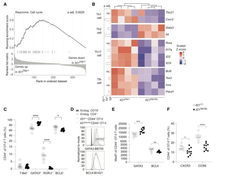 同时科研小组在基因层面也进行了探索,科研小组对实验组和对照组的细胞进行RNA测序转录组学分析,显示391个差异表达基因。GSEA分析显示,细胞周期、转录和信号传导是受差异影响最大的途径(Fig3A)。使用KEGG数据库的分析显示,在IL21充足的OT-II T细胞中,两个密切相关的通路过度表达,一个与系统性红斑狼疮相关,另一个与炎症性肠病和Th17细胞分化相关,这都与炎症反应密切相关。结合细胞实验的结果,IL-21对于滤泡T细胞分化过程中发挥着重要的作用。这说明 IL-21具有双重作用,既可以促进T细胞扩增也可以促进向Th17和Tfh细胞系的分化,抑制其向Th2分化。IL-21不仅仅影响产生IL-21的T细胞,还会分散式影响其他T细胞。