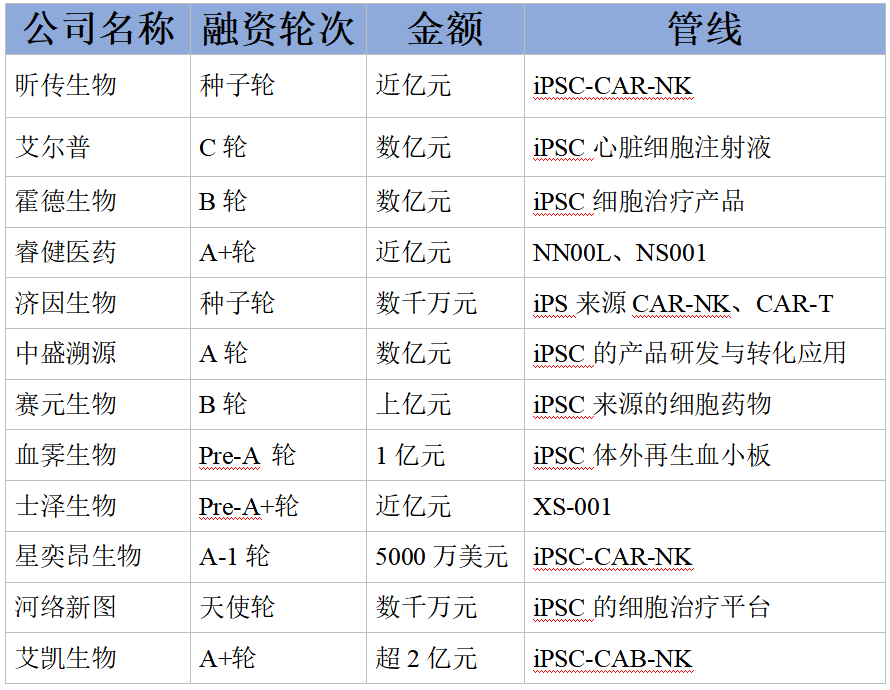 根据Clinical Trials临床试验数据库的检索结果,截至2023年3月底,有关iPSC的临床试验有137项,今年也有6个相关试验完成临床注册,涉及关节炎、移植物抗宿主病、心力衰竭、多发性骨髓瘤、淋巴瘤、呼吸衰竭、帕金森病、卒中等疾病。全球及中国在研iPSC治疗产品衍生种类主要包括CAR-iNK、多巴胺能神经前体细胞、CAR-iMac、i-MSC、心肌细胞、其他神经细胞、CAR-iT、胰岛细胞等。其中,CAR-iNK是衍生最多的细胞类型,占27%。进入临床阶段的iPSC衍生细胞种类包括 i-MSC、心肌细胞、CAR-iNK、CAR-iT、多巴胺能神经前体细胞。庞大的临床试验支撑着市场发展的基础,链接着从实验室和市场的iPSC疗法。我国作为人口大国,对于iPSC疗法的需求必然是旺盛的,预计到2026年,市场规模将达到8240万美元,预测期内的复合年增长率(CAGR)为8.5%。资本方也对我国市场持乐观态度,融资事件频繁发生,几乎覆盖第一梯队的研究企业。
