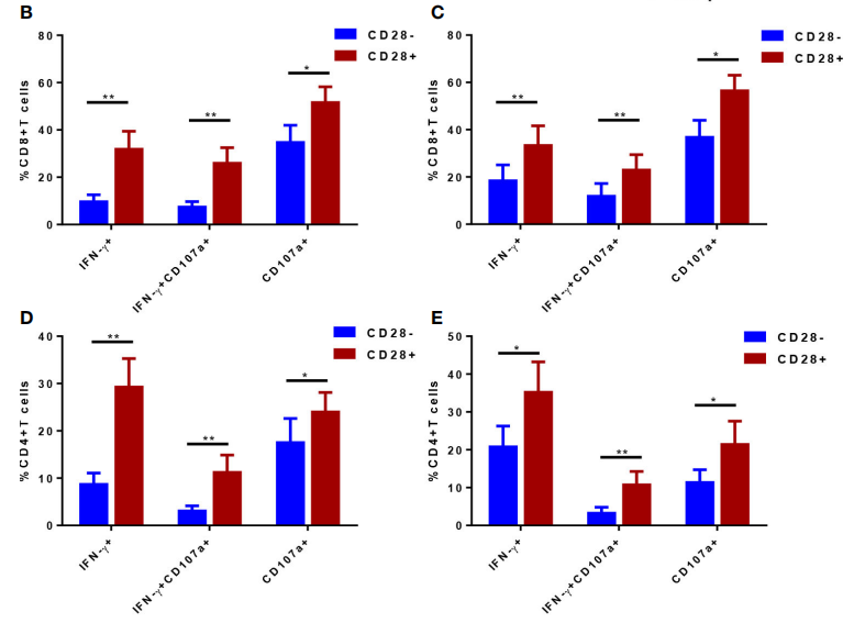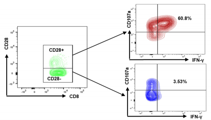 据报道,自身炎症和自身免疫性疾病患者中CD4+CD28-T细胞会增加,如多发性硬化症和类风湿性关节炎。CD4+CD28-T细胞会在受自身免疫过程影响的组织中浸润。CD4+CD28-细胞在多种情况下也会升高,包括急性冠状动脉综合征、慢性肾移植排斥反应和巨细胞病毒感染。这可能是和CD28刺激产生干扰素和细胞毒性蛋白穿孔素和颗粒酶B有相关性,人体为了减少机体的应激反应进一步减少CD28蛋白的表达。2023年的一篇报道,Huang Y等人[2]发现T细胞终末期的分化伴随着CD28表达的减少。CD28表达减少可以作为T细胞耗竭的一个指标。CD28-T细胞亚型的增多伴随着病情的恶化。另一方面,急性髓细胞白血病(AML)患者研究中发现病情的好转伴随着CD28+T细胞亚型的增多。CD107a是 NK 细胞脱颗粒的标志物,NK 细胞的杀伤活性和CD107a表达水平显著相关。CD107a 分子检测可反映 NK 细胞活性。另外,INF-γ也被看做是T细胞脱颗粒能力的一个特征。CD107a和INF-γ都可以看做是T细胞脱颗粒能力的的指示指标。AML患者CD28+和CD28-T细胞亚群CD107a和INF-γ指标做检测,可以看出CD28+的T细胞CD107a的表达和INF-γ的分泌都优于CD28-的T细胞(Figure A)。