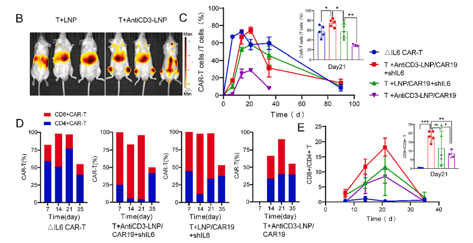 研究小组将AntiCD3-LNP/CAR19、LNP/CAR19 + shIL6和 AntiCD3-LNP/CAR19 + shIL6转染T细胞,然后与靶细胞孵育48⼩时,证明了强大的细胞毒性;体内实验表明,AntiCD3-LNP/CAR19+shIL6能稳定地转染T细胞,并在90天内保持产生CAR-T杀伤肿瘤。显著延长了白血病模型小鼠的存活时间,证明了制备的aCD3-LNP具有与传统体外制备的CAR-T细胞相同的抗肿瘤作用。这么明显的实验结果得益于CD3抗体强大的肿瘤细胞定向作用,在最大限度上提高了有效载荷的细胞杀伤作用。