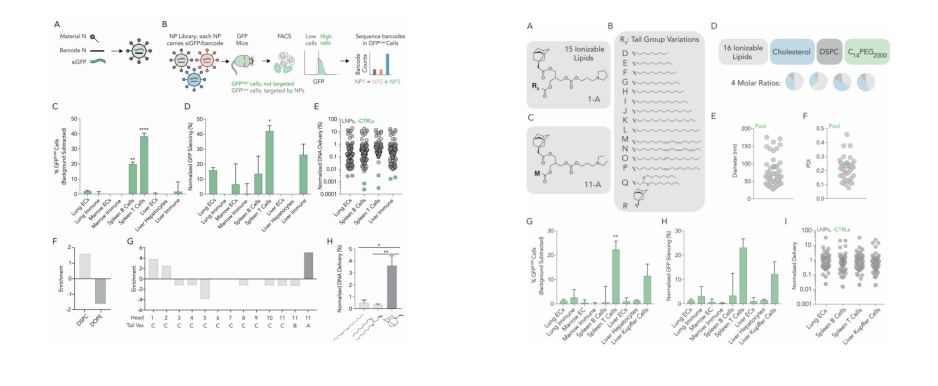 第一代脂库的筛选结果提供了初步的证据,即含金刚烷的LNP可以在不使用靶向配体的情况下将核酸siRNA体内递送至T细胞。为了进一步研究金刚烷与siRNA传递之间的关系,研究人员用含金刚烷的LNP进行了第二次体内筛选。最终的结果说明了cLNP不优先靶向肝细胞,递送的方向与化学成分和载体尺寸相关。这一发现颠覆了之前对于LNP递送的固有认识,科研小组也表示希望他们的研究成果科研激发其他的发现和突破。Dahlman教授的期望没有落空。塔夫茨大学的实验室使用基因文库进行筛选发现脂质纳米颗粒的器官靶向性是由脂质化合物的连接基团决定的,需要靶向肝脏就选择连接基团为酯键的O系列;如果需要靶向肺部就选择连接基团为酰胺键的N系列。
