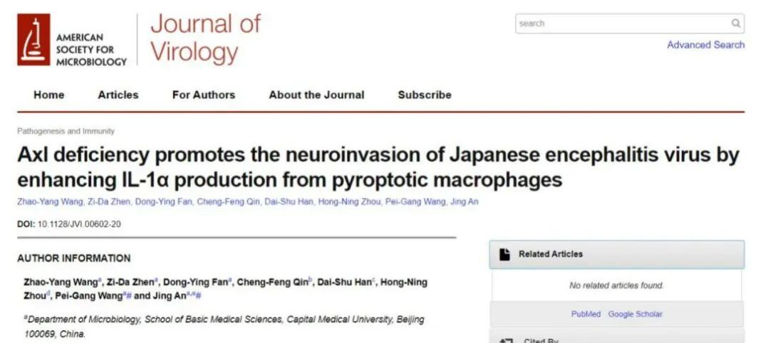 2020年7月,首都医科大学基础医学院安静教授团队在国际病毒学期刊《Journal of Virology》杂志以封面文章的形式发表题为"Axl deficiency promotes the neuroinvasion of Japanese encephalitis virus by enhancing IL-1α production from pyroptotic macrophages"的研究论文[4]。