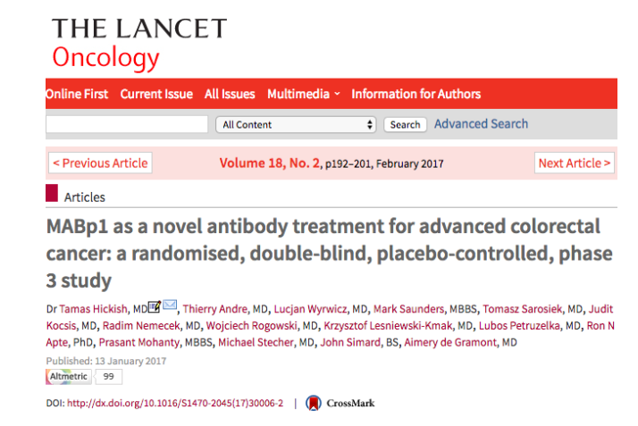 [5]Tamas Hickish.et al. MABp1 as a novel antibody treatment for advanced colorectal cancer: a randomised, double-blind, placebo-controlled, phase 3 study. Lancet Oncol. January 13, 2017.