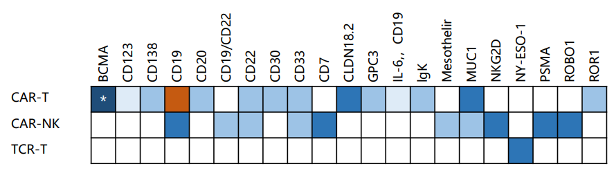 CAR-T技术是当前国内市场独有上市的细胞治疗产品:2021年,中国NMPA批准两款CAR-T上市;2022年2月,南京传奇研发的CAR-T产品 cital-cel成功在美国上市销售。许多靶点为免疫细胞共有,因此,CAR-T、CAR-NK、TCR-T和CAR-M等都会成为不同公司研发管线的布局组成部分。