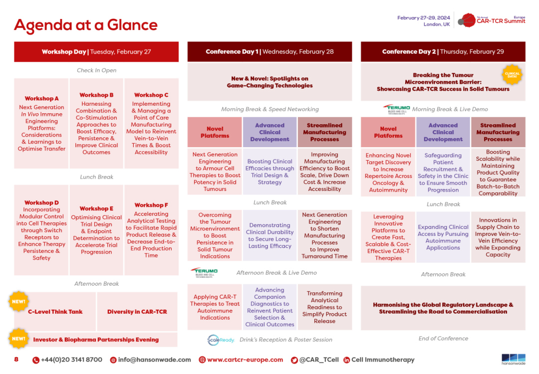 第七届CAR-TCR Summit欧洲峰会将于2024年2月27-29日在英国伦敦举办。CAR-TCR Summit峰会是一场世界巅峰级盛会,全球顶尖团队将共聚于此探讨从研发到商业化全流程,以及如何提供安全、有效和商业上可行CAR-TCR疗法。
