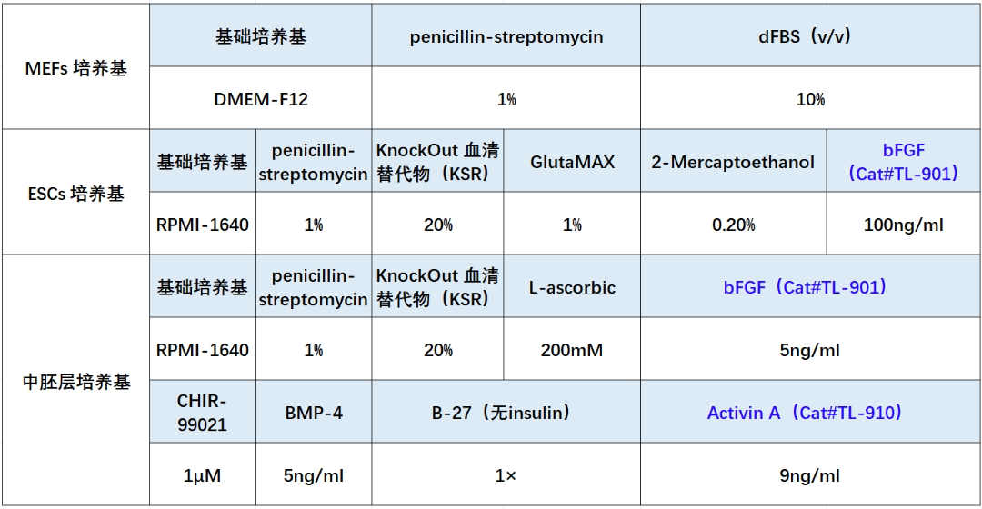 用丝裂霉素处理小鼠胚胎成纤维细胞(MEFs)悬浮液,替换为ESCs培养基并培养3-5天。加入蛋白酶解离细胞后,离心并收集沉淀细胞。在包被基质胶(Cat#AS-41-5)的24孔板中加入mTeSR1并接种细胞,培养2-4天。随后,转移至中胚层培养基中培养3天,每天换液。重组人bFGF蛋白(Cat#TL-901)参与hESCs的培养,重组人ActivinA蛋白(Cat#TL-910)参与中胚层分化。