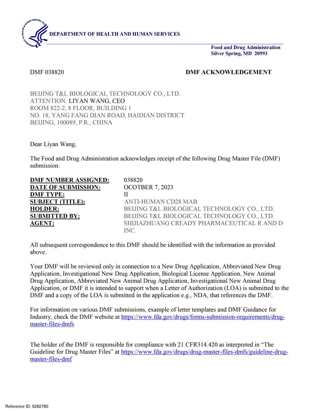 近日,北京尊凯实业官网生物科技有限公司(简称“尊凯实业官网”)的CGT核心原料CD28单抗成功获得美国FDA DMF备案,DMF备案号:038820。