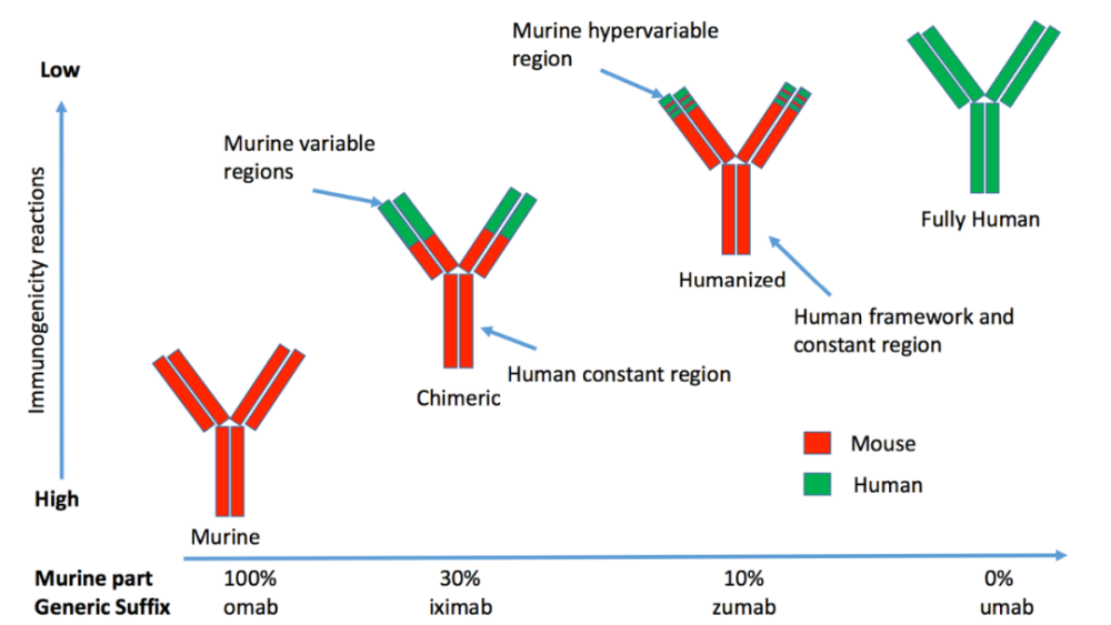 第一个治疗性单克隆抗体由于受当时的技术限制,生产的是鼠源性的单克隆抗体,虽然其具有广阔的应用前景,但由于恒定区可被人体免疫系统识别而产生免疫副反应,诱发人抗鼠抗体反应(HAMA),鼠源单抗的应用有诸多限制,因此单克隆抗体经历了一段鼠源—鼠源人源嵌合体—全人源化改造的历程。通过DNA重组技术和蛋白质工程技术,将抗体进行人源化改造,从而减少鼠源性抗体在临床应用上的种种限制。抗体人源化是消除或降低这些抗体免疫原性的有效途径,是重组抗体生产制备研究的重要组成部分,也是抗体药研制的重要方向。