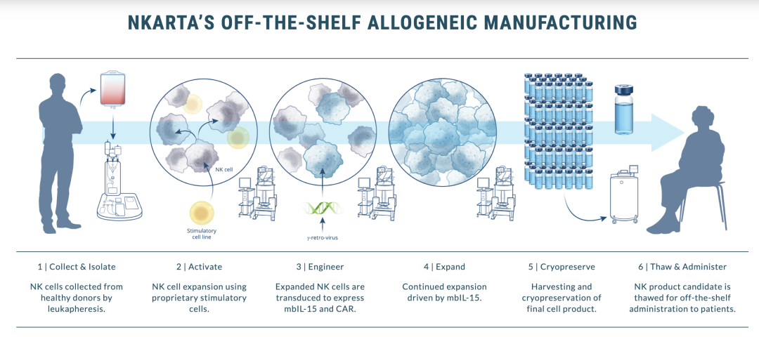 通用型免疫细胞治疗产品的细胞来源为异体,尤其需要关注起始原材料的安全性问题。这要求企业建立合理的供者筛选程序和标准,并尽量收集供者的相关特征,还需筛查供者是否存在乙型肝炎病毒 (Hepatitis B virus,HBV)、丙型肝炎病毒(Hepatitis C virus, HCV)、人类免疫缺陷病毒 (Human immunodeficiency virus,HIV)、梅毒螺旋体等感染。技术导向的Nkarta公司为了加速CAR-NK通用型的商业化过程,建立了专有现货型NK细胞治疗平台旨在通过有效免疫细胞的强劲扩张、增强的靶向性和延长的持久性,最大限度地提高同种异体NK细胞的治疗效果,从而释放出强大而持久的抗癌免疫介导攻击。