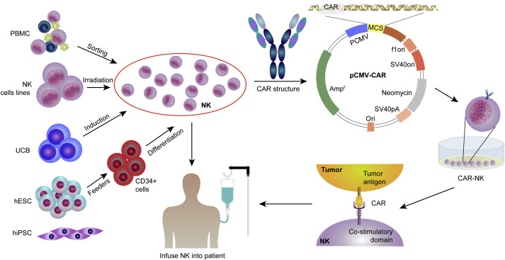 CAR-NK细胞免疫治疗所用细胞的来源主要为患者自身外周血NK细胞,涉及采集NK细胞进行无菌分离、体外扩增后制成静脉输注制品等过程。该制备过程需要遵循GMP操作规范,保证细胞制品的安全性。