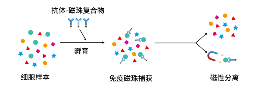 (1)免疫磁珠分选:基于细胞表面抗原能与连接有特异性抗体磁珠结合的特性,在外加磁场作用下,细胞通过与磁珠上偶联的抗体特异性识别而被吸附,在磁场中停留,从而达到细胞分离的目的。