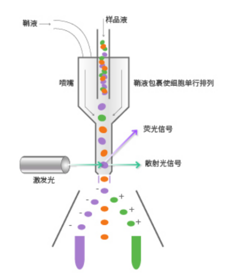 (2)流式细胞分选:通过不同的荧光素标记样本中的一种或多种细胞,再经由流式细胞仪区别不同细胞的相关参数(光散射和荧光特征),将不同细胞分离。