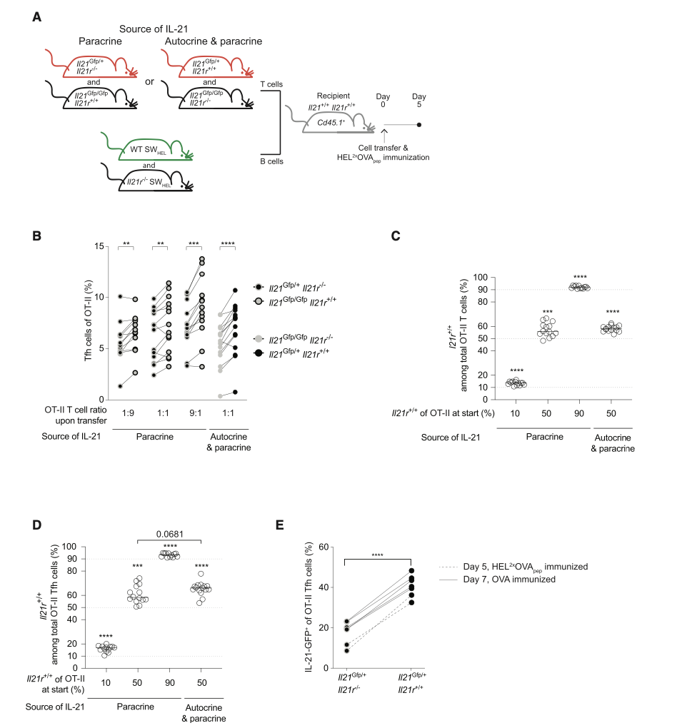 在免疫学飞速发展的背景下,科学家发现IL-21与T细胞以及B细胞的分泌关系密切,探索这其中的调节模式可以帮助我们寻找生产更高效的疫苗以及治疗自身免疫疾病的新方法。抗体的产生依赖于抗原特异性B细胞和T细胞的相互作用,B细胞向抗体分泌细胞的分化发生在免疫器官的独特微结构生发中心(Germinal centers ),IL-21作为T细胞衍生的多效性细胞因子,同时可以促进生发中心形成。这三者错综复杂的关系引起了来自莫纳什大学的Isaak Quast教授的注意,并且带领他的研究团队进行了实验探究。为了分析同源T细胞和B细胞的增殖和分化,研究小组开发了一种过继转移和免疫系统OT-II-OVA,这种系统可以在调节IL-21时分析同源T细胞及B细胞增殖与分化情况。研究小组设计了符合实验目的的对照组以及实验组,分析结果后惊喜地发现拥有充足IL-21的实验组中CD4+T细胞明显扩增和分化(Fig2),这说明IL-21可以直接促进T细胞增殖并分化为Tfh细胞,这个过程中并没有涉及B细胞【2】。这提示我们,IL-21是可以独立作用于T细胞的。