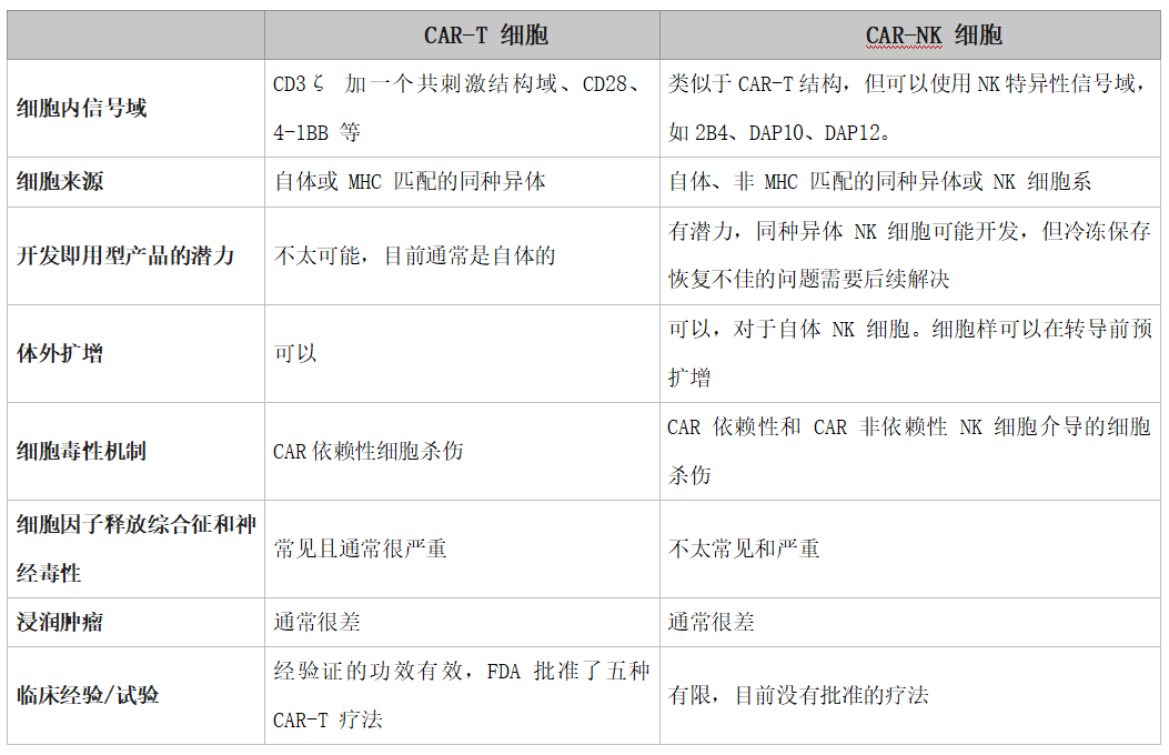 CAR-NK细胞脱胎于CAR-T细胞,因此他们就不免被一直拿来做比较,相比与CAR-T细胞,CAR-NK细胞拥有几个明显的优势。首先是细胞来源方面,NK 细胞可以从预先存在的细胞系或主要组织相容性复合体 (MHC) 的同种异体 NK 细胞中获得。另一方面CAR-NK细胞可以通过 CAR 依赖性和 CAR 非依赖性两个途径杀死癌细胞,细胞因子释放综合征和神经毒性也较小【1】。二者具体的对比见下表
