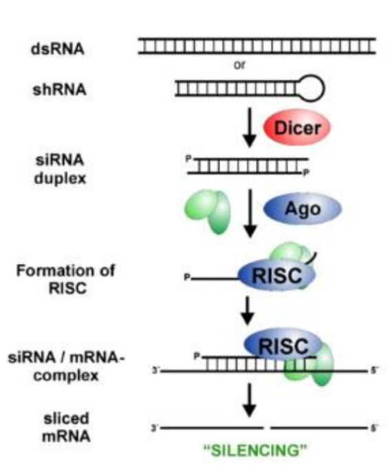 siRNA的抑制作用是通过其与AGO蛋白组装成的RNA诱导沉默复合体(RISC)发挥的。一条链被降解,另一条链则与靶基因的mRNA互补配对,使其被切割降解,从而达到治疗相关疾病的目的。与传统的基因治疗相比,siRNA具有高度特异性、快速、可逆性等优点,可以应用于各种真核生物的基因功能研究,药靶发现及药物筛选中广泛应用。例如siRNA靶向恶性肿瘤的基因可以通过局部或系统性给药来治疗肿瘤,病毒感染和遗传疾病也都有涉及。