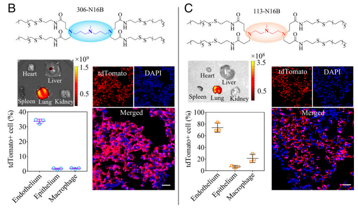第一代脂库的筛选结果提供了初步的证据,即含金刚烷的LNP可以在不使用靶向配体的情况下将核酸siRNA体内递送至T细胞。为了进一步研究金刚烷与siRNA传递之间的关系,研究人员用含金刚烷的LNP进行了第二次体内筛选。最终的结果说明了cLNP不优先靶向肝细胞,递送的方向与化学成分和载体尺寸相关。这一发现颠覆了之前对于LNP递送的固有认识,科研小组也表示希望他们的研究成果科研激发其他的发现和突破。Dahlman教授的期望没有落空。塔夫茨大学的实验室使用基因文库进行筛选发现脂质纳米颗粒的器官靶向性是由脂质化合物的连接基团决定的,需要靶向肝脏就选择连接基团为酯键的O系列;如果需要靶向肺部就选择连接基团为酰胺键的N系列。