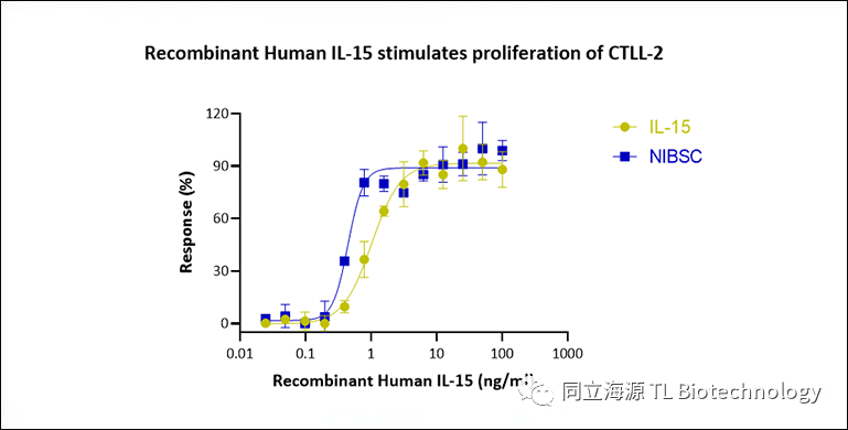 Fig2:重组人IL-15蛋白(长效型)可刺激小鼠T淋巴细胞CTLL-2增殖,比活性>5×106IU/mg(NIBSC代码:95/554)