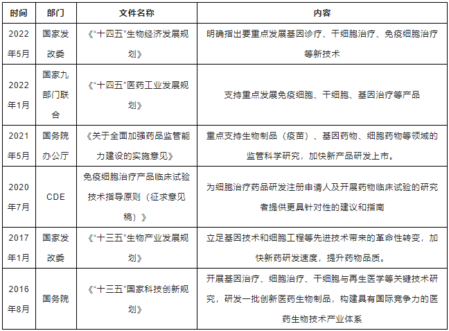近年来,国内发布关于基因细胞治疗的主要政策