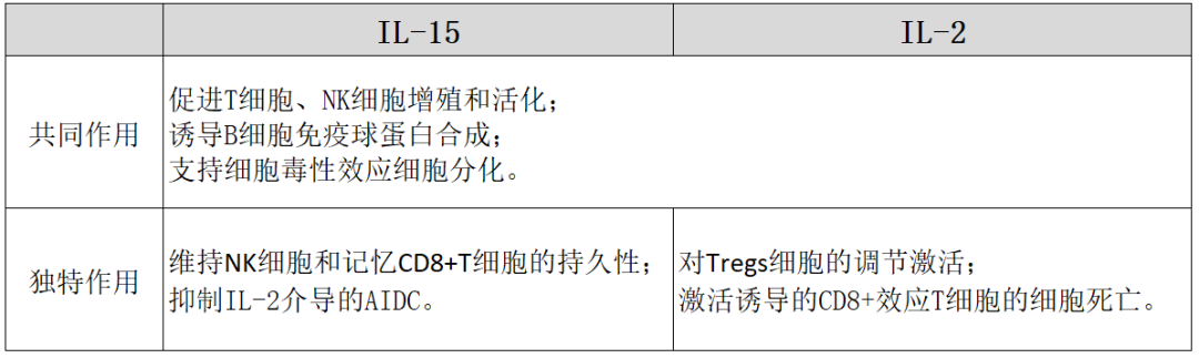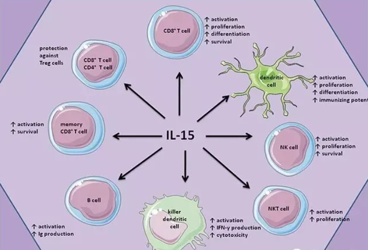 IL-15与IL-2具有类似的生物学功能。IL-15通过与IL-2共用γc受体亚单位,从而刺激T细胞的活化与增殖。IL-15抗肿瘤的特性源于其对CD8+效应T细胞的刺激活性,同时IL-15可活化NK细胞、NKT细胞和γδT细胞,并且能诱导B淋巴细胞增殖和分化,以及增加免疫球蛋白分泌。