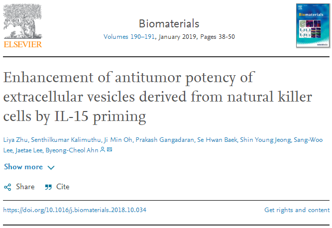 2018年,韩国庆北大学Byeong-Cheol Ahn教授团队在《Biomaterials》杂志上在线发表了标题为“Enhancement of antitumor potency of extracellular vesicles derived from natural killer cells by IL-15 priming”的研究论文[4]。