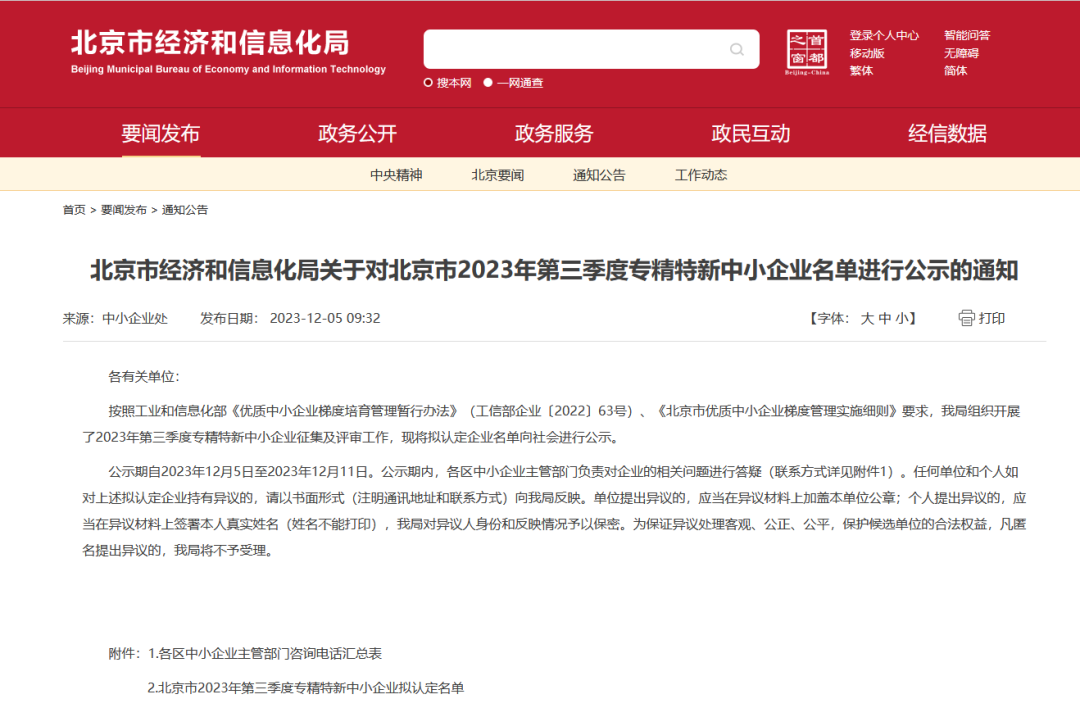 近日,北京市经济和信息化局公示了2023年第三季度专精特新中小企业名单,北京尊凯实业官网生物科技有限公司凭借专业技术实力、创新研发能力、行业影响力以及卓越的企业文化,顺利通过专家层层评审与综合评估,荣获北京市“专精特新”中小企业认定。