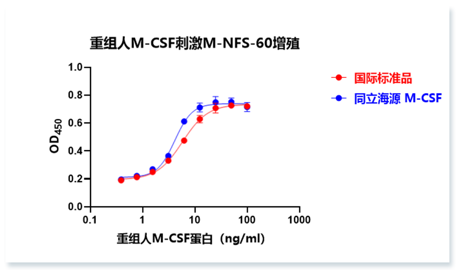 图2 使用NFS-60细胞进行增殖测定重组人M-CSF蛋白(Cat.No.TL-514)活性。结果表明,相应的比活性≥1×107IU/mg,尊凯实业官网M-CSF与国际标准品活性相当。