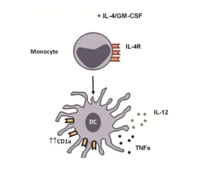 IL-4联合GM-CSF促进单核细胞向树突状细胞生成和稳定。从血液中分离出PBMC,用AIM-V培养基或RPMI 1640 完全培养基培养得到单核细胞,置换培养基并加入IL-4和GM-CSF,诱导单核细胞分化为不成熟的树突状细胞。换液并加入TNF-α、IL-1β和IL-6,可以得到成熟的树突状细胞。