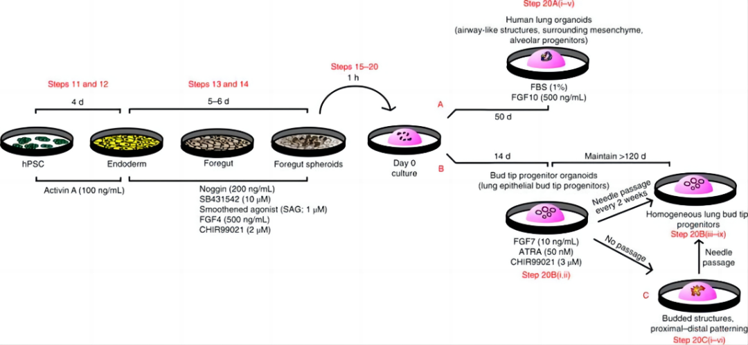 肺类器官培养通常需要三阶段,诱导多能干细胞(hPSCs)分化为内胚层,内胚层分化为前肠细胞,以及前肠细胞进一步分化为芽尖祖细胞,最后经过一定时间的培养形成人肺类器官。细胞因子作为肺类器官培养的基本原料,参与细胞的定向分化与增殖。